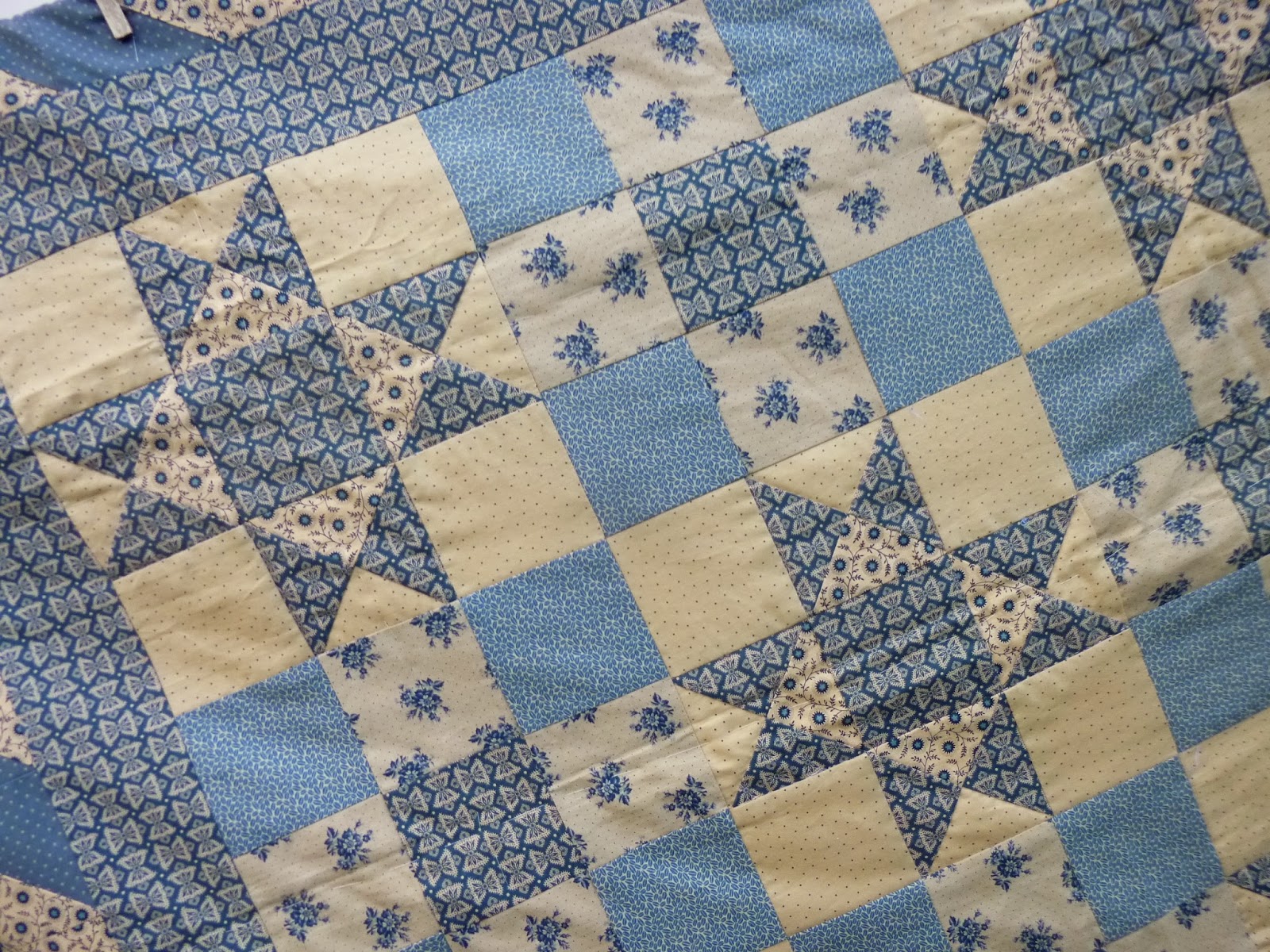 Here is one of my current projects that I'm starting to hand quilt - Gettysburg Ohio Star quilt, which I created using Ohio Star and Nine Patch blocks in reproduction American Civil War fabrics in blue and tan.